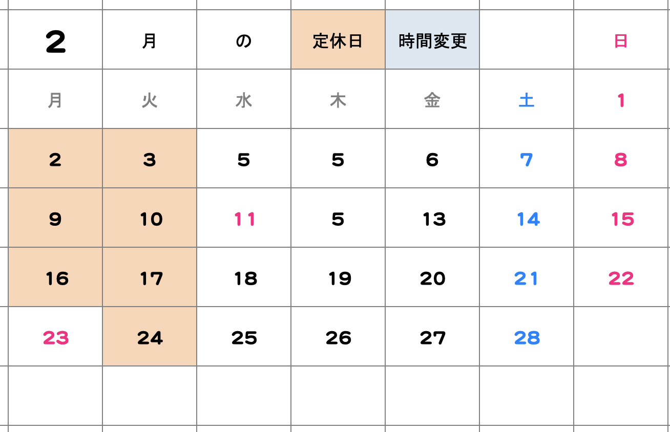 2月の定休日